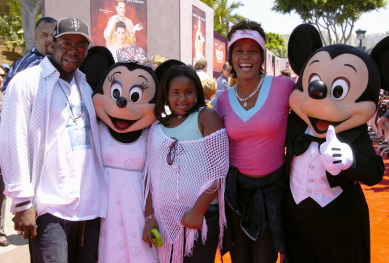 Whitney Houston, Bobby Brown and their daughter Bobbi Kristina are greeted by Mickey Mouse and Minnie Mouse at the Disneyland Resort August 7, 2004 in Anaheim, California. (Photo by Lisa Rose/Disney Parks via Getty Images)