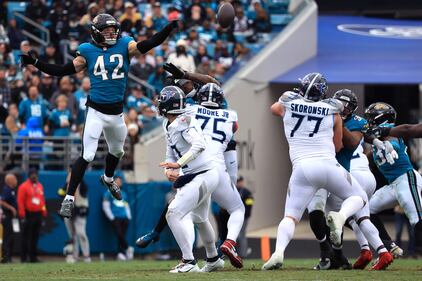 Tennessee Titans v Jacksonville Jaguars - NFL 2025 JACKSONVILLE, FLORIDA - JANUARY 04: Andrew Wingard #42 of the Jacksonville Jaguars deflects a pass from Brandon Allen #10 of the Tennessee Titans during the fourth quarter at EverBank Stadium on January 04, 2026 in Jacksonville, Florida. (Photo by Mike Carlson/Getty Images) (Mike Carlson/Getty Images)