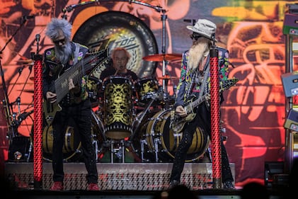 ZZ Top Perform At Viejas Casino ALPINE, CALIFORNIA - NOVEMBER 02: (L-R) Elwood Francis, Frank Beard, and Billy Gibbons of ZZ Top perform on stage at Viejas Casino & Resort on November 02, 2025 in Alpine, California. (Photo by Daniel Knighton/Getty Images) (Daniel Knighton/Getty Images)
