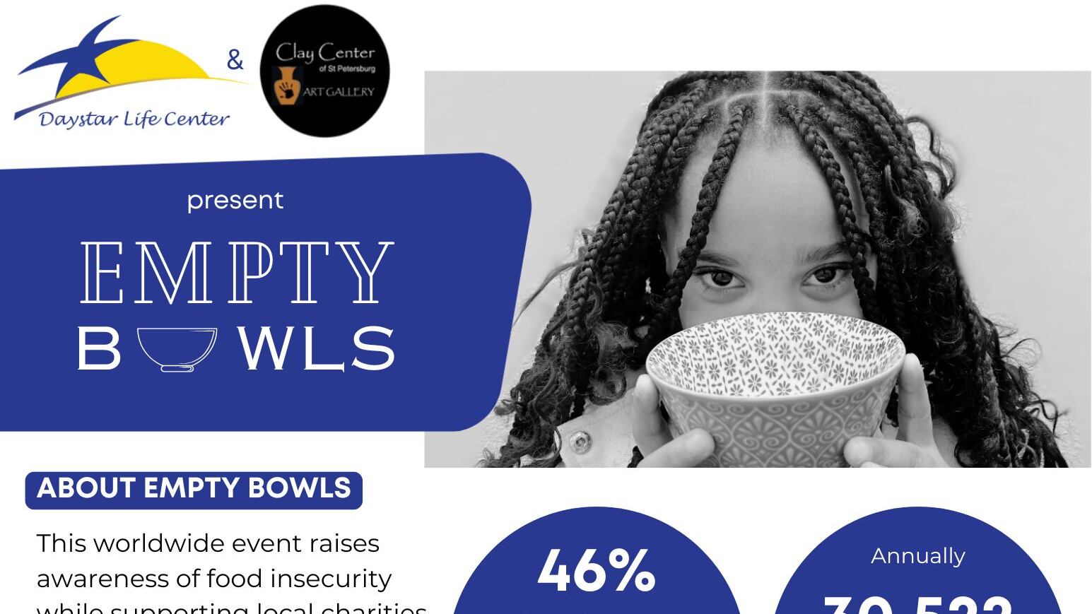 Join the Daystar Life Center for Empty Bowls; a global movement raising awareness of food insecurity while raising critical funds for local charities who fight hunger!