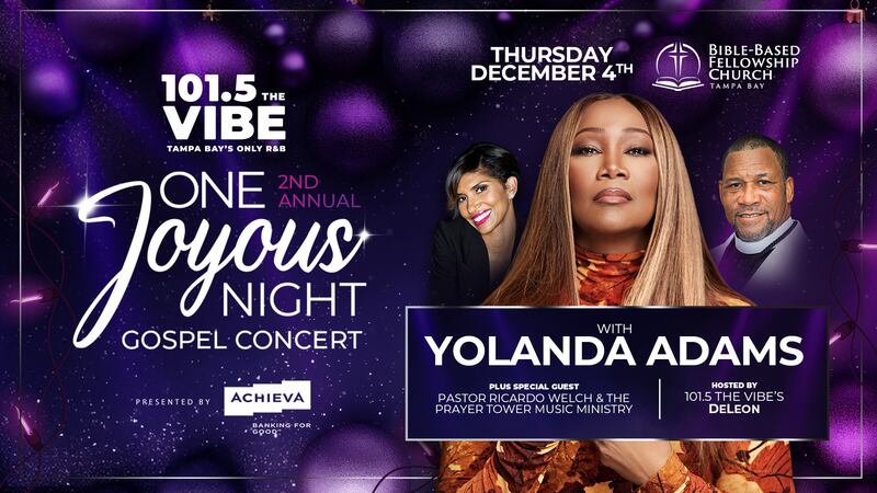 Achieva Credit Union and 101.5 The Vibe are bringing friends and family together to enjoy this holiday season with the unforgettable energy of a live gospel concert featuring the biggest inspirational voices in the country! Join us Thursday night, December 4th at the Bible-Based Fellowship Church on Ehrlich Rd in Tampa for the 2nd Annual One Joyous Night featuring Yolanda Adams! Plus, special guests Pastor Ricardo Welch and The Prayer Tower Praise Ministry.
