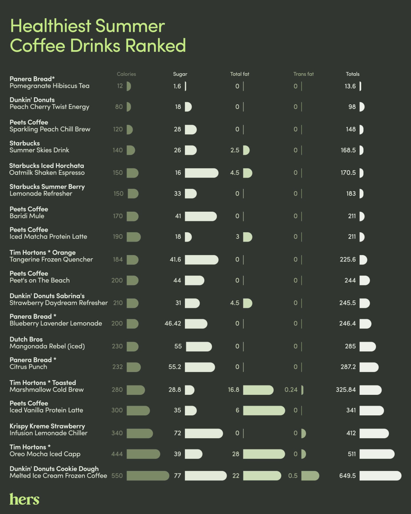 While an orange-flavored energy drink or a protein latte seem like the right choice for a quick caffeine boost, these beverages often have hidden sugar or high fat content. That's why Hers analyzed the nutrition data of the summer menus from the largest U.S. fast food and cafe chains. A large majority of the drinks contain more than 30 grams of sugar, but a few are healthier than meets the eye. Read on to learn more about where to find the healthiest options and which drinks are better suited as an occasional treat.