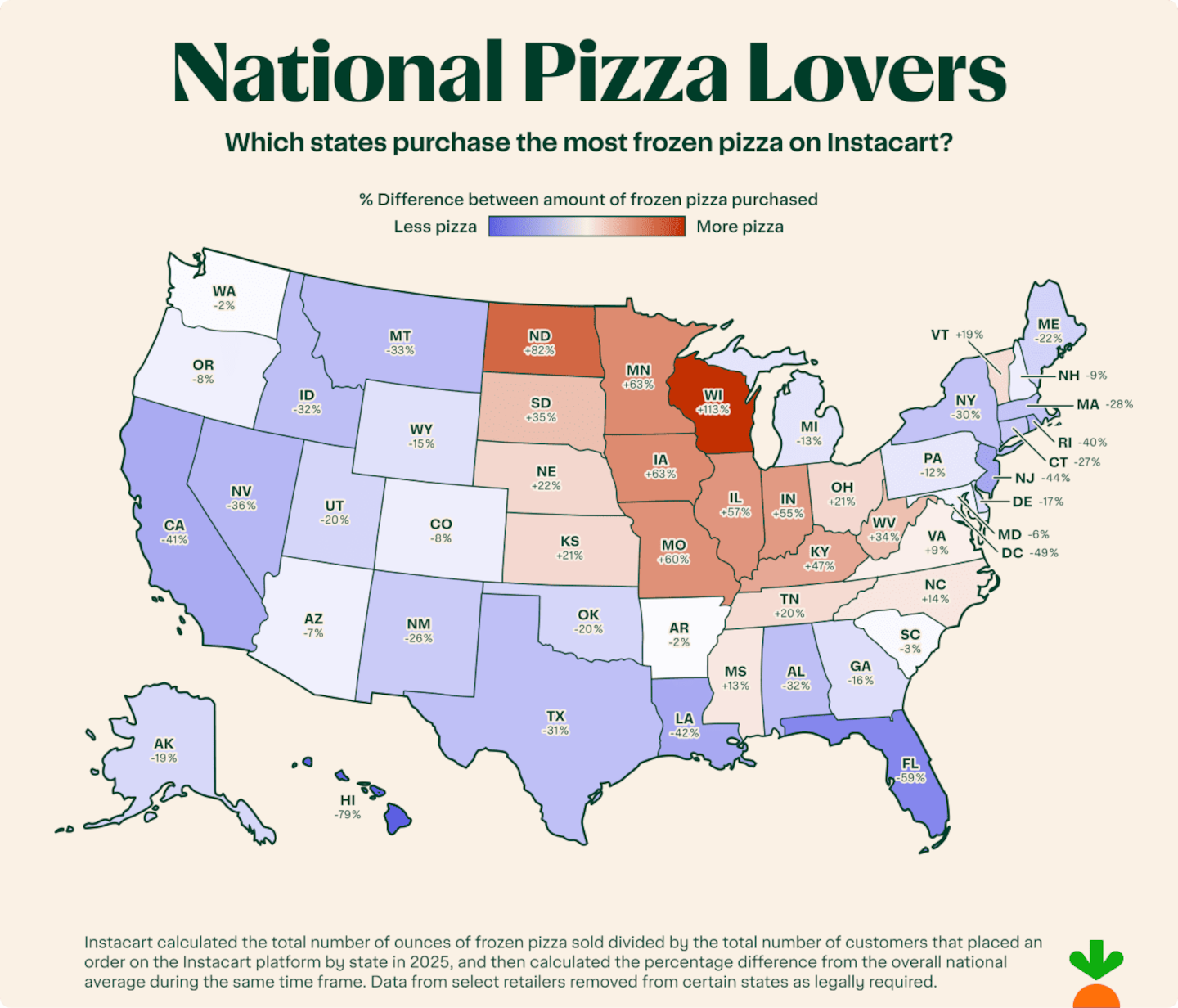 Some states take pizza night more seriously than others. Measured by ounces of frozen pizza purchased per customer in 2025, Wisconsin takes the crown as our most frozen pizza-loving state, ordering 113% more per customer than the national average!