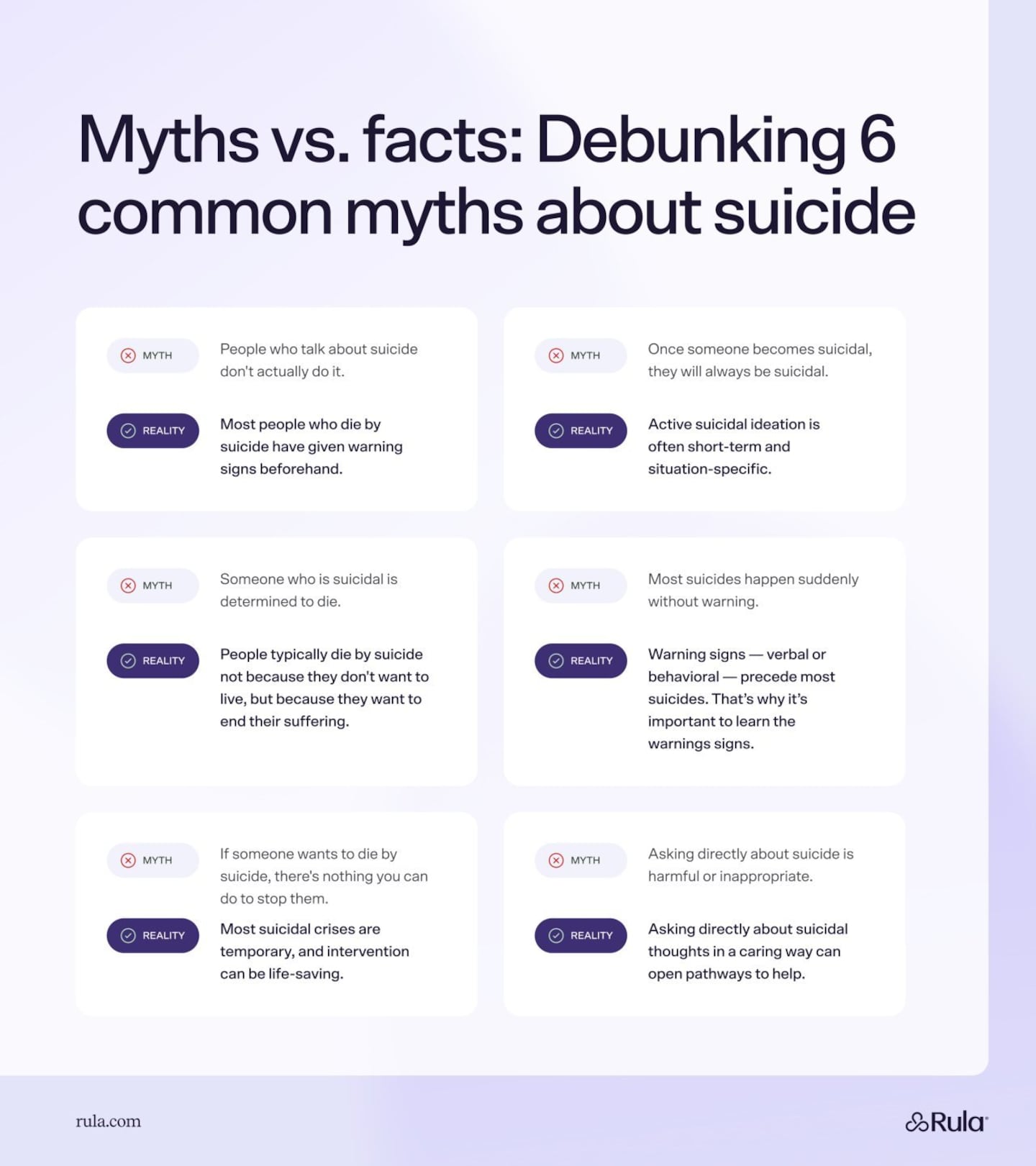 Despite its prevalence, suicide can still be difficult to talk about. So, in honor of National Suicide Prevention Month, Rula is debunking some common myths related to suicide. Learning the facts about suicide can help you spot the warning signs, challenge stigmas, and potentially save a life.