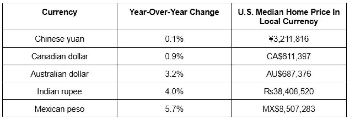 According to a Redfin analysis of exchange rates for a selection of major foreign currencies against the U.S. dollar. The analysis converts the median U.S. home price into the equivalent value in foreign currencies using monthly average exchange rates. All data as of June 2025.