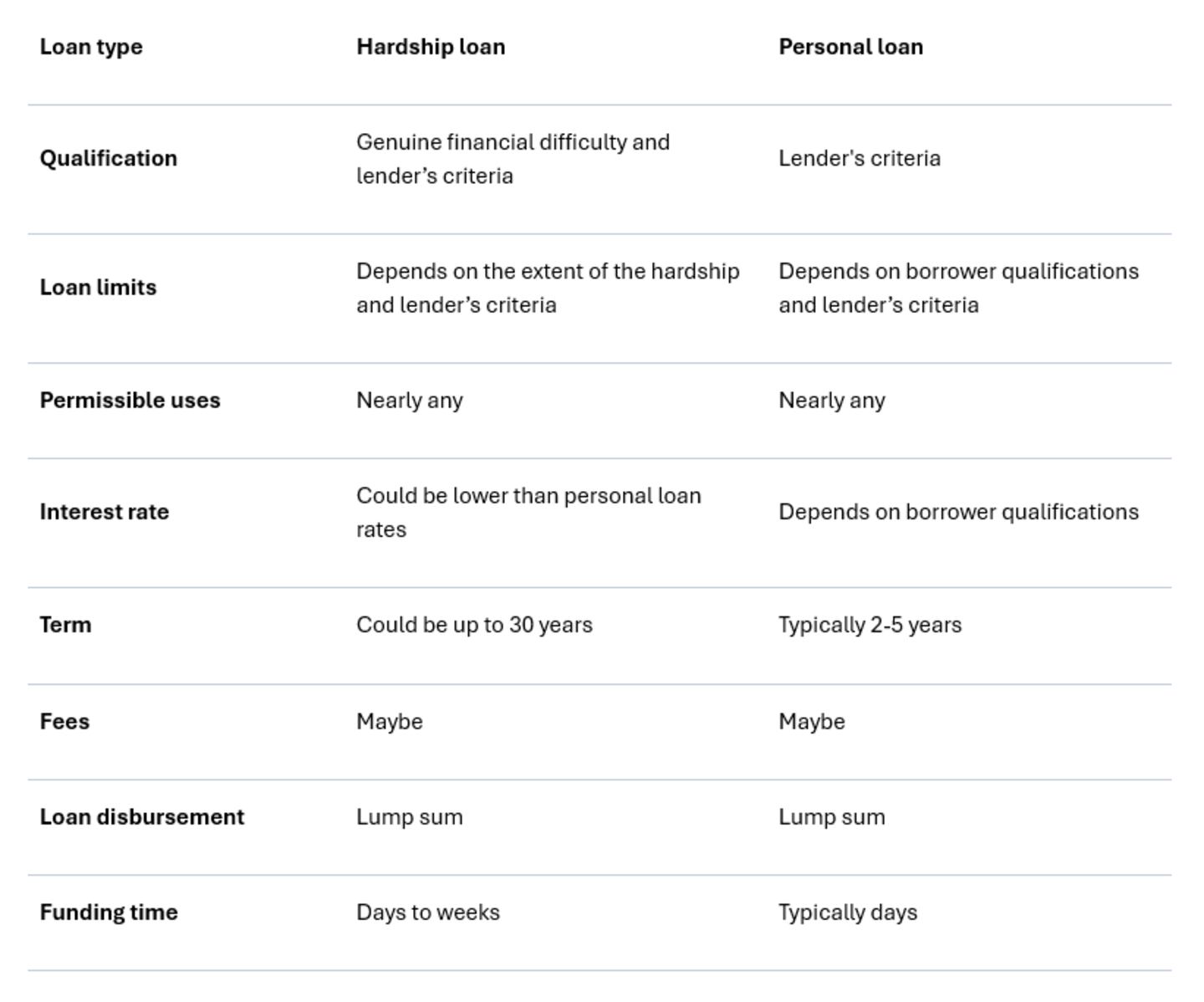 Comparing hardship loans and personal loans