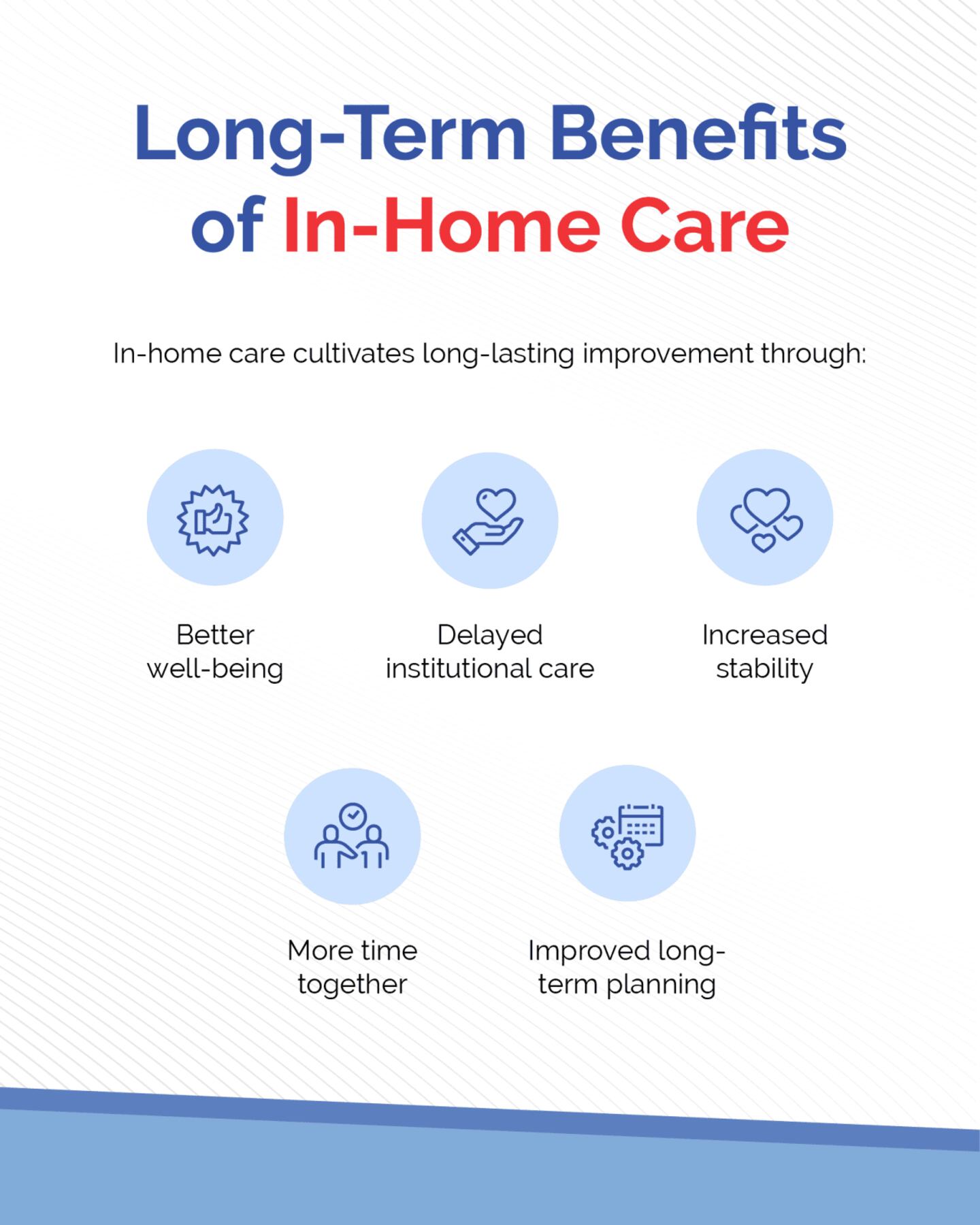In-home care relieves stress, increases stability, and supports long-term planning. It can provide loved ones with new connections and professional stability without leaving their homes. In-home care cultivates long-lasting improvement through: