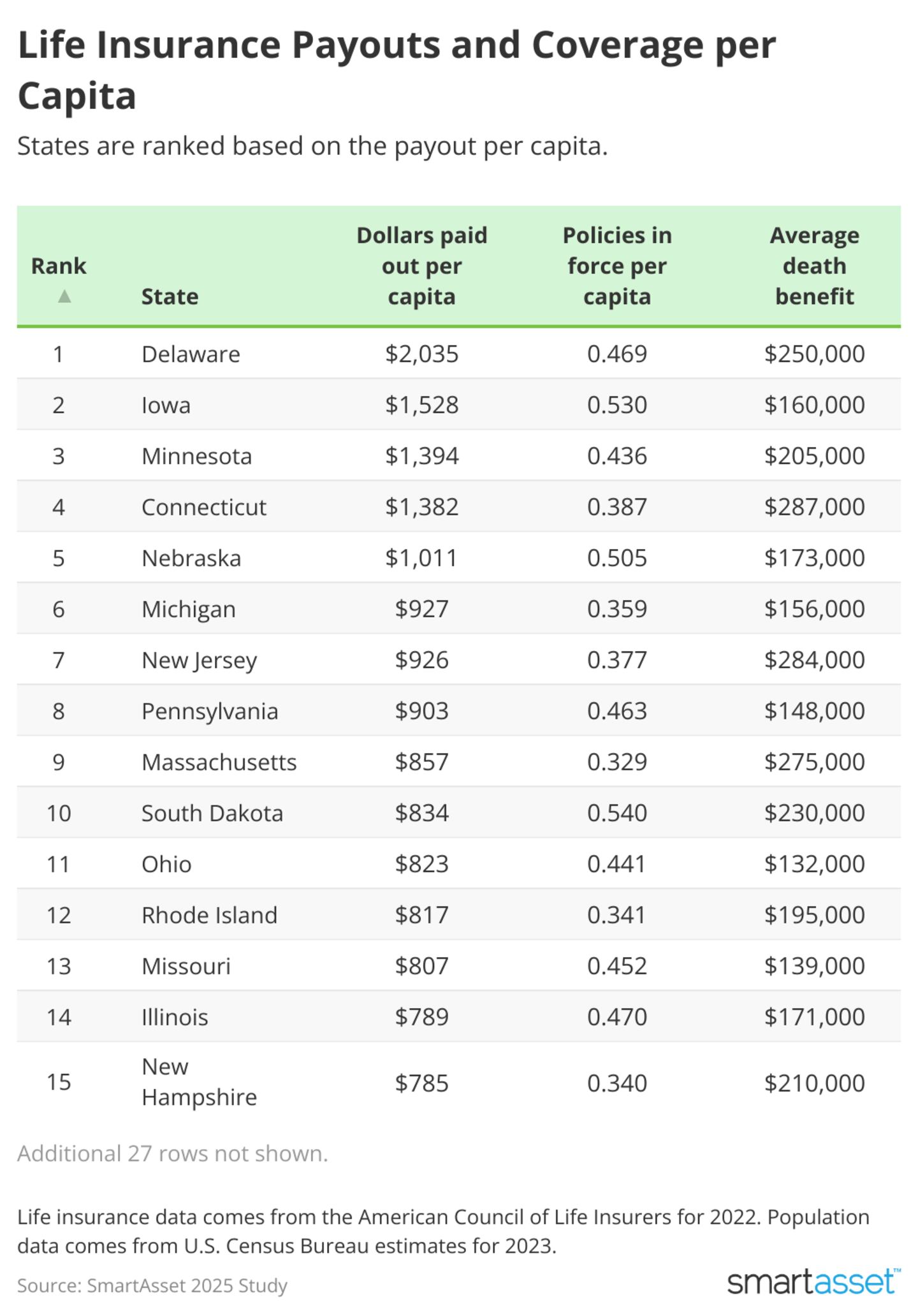 To better understand these trends, SmartAsset examined life insurance data by state, examining average payouts, the number of policies in force per capita, and death benefits for the year 2022.