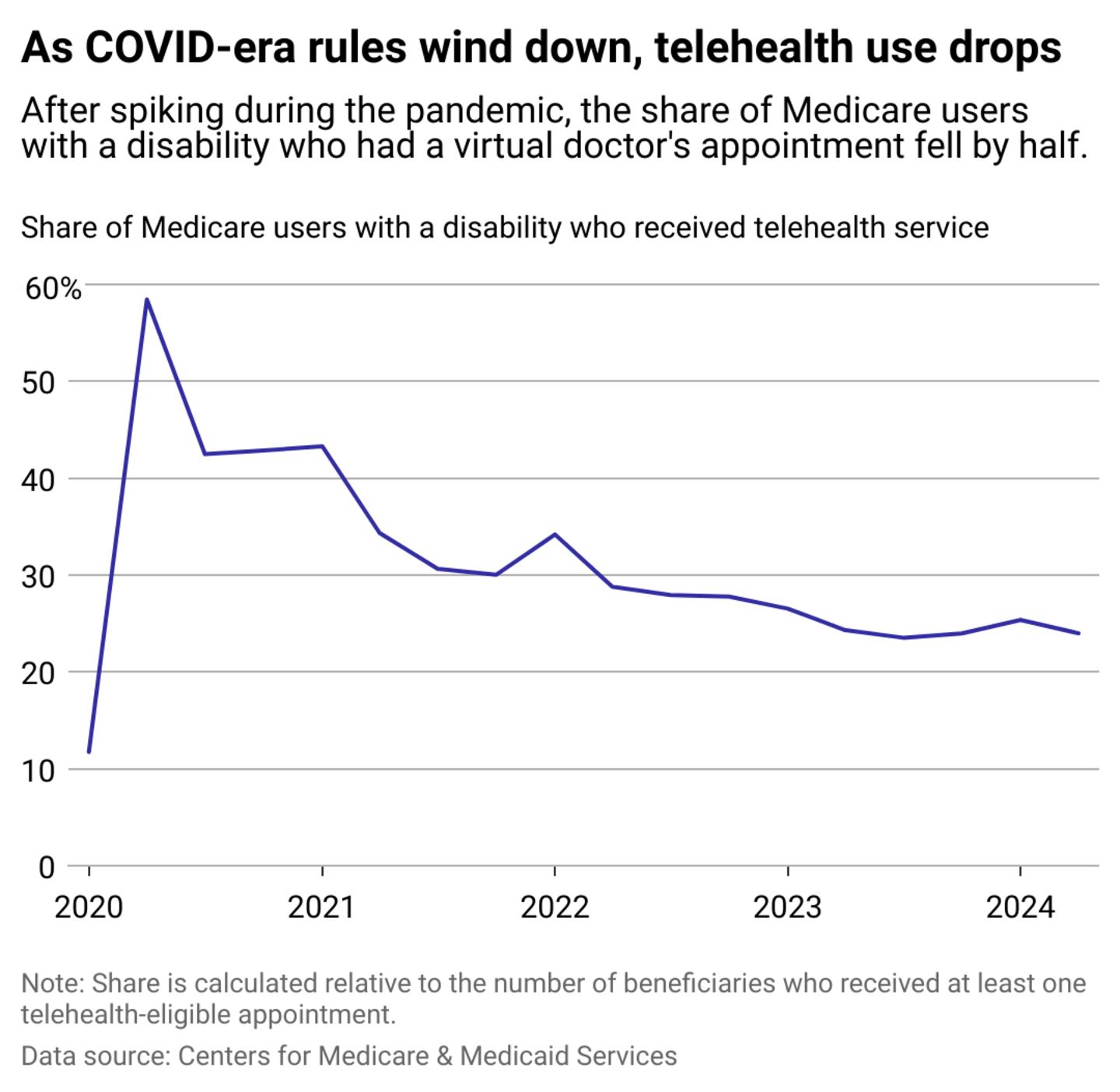 The share of Medicare users who utilized at least one telehealth appointment was highest in 2020, when about 48% of eligible visits were conducted remotely, according to a December 2024 telehealth trends report from the CDC. For Medicare users with a disability, that number was slightly higher, with almost 60% using the service. However, by 2023, usage fell by about half for both groups to just about 1 in 4 people who relied on virtual visits.