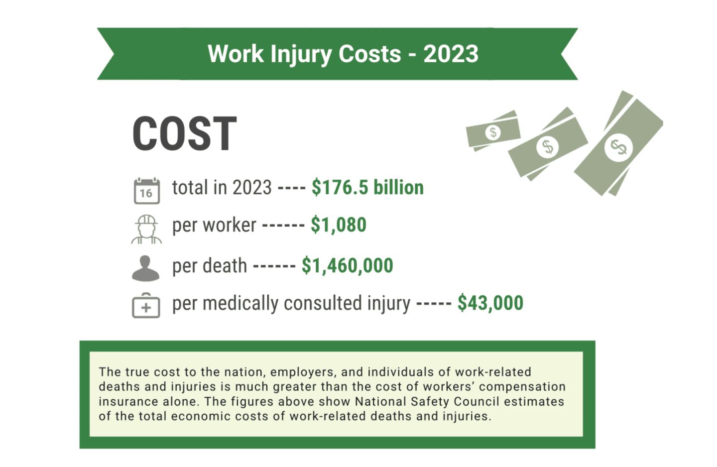 2023 data from the National Safety Council placed the cost of workplace injuries at $176.5 billion, or about $1,080 per worker, and $43,000 per medically-consulted injury. That same report also found 103,000,000 days of lost work from work injuries sustained that same year.