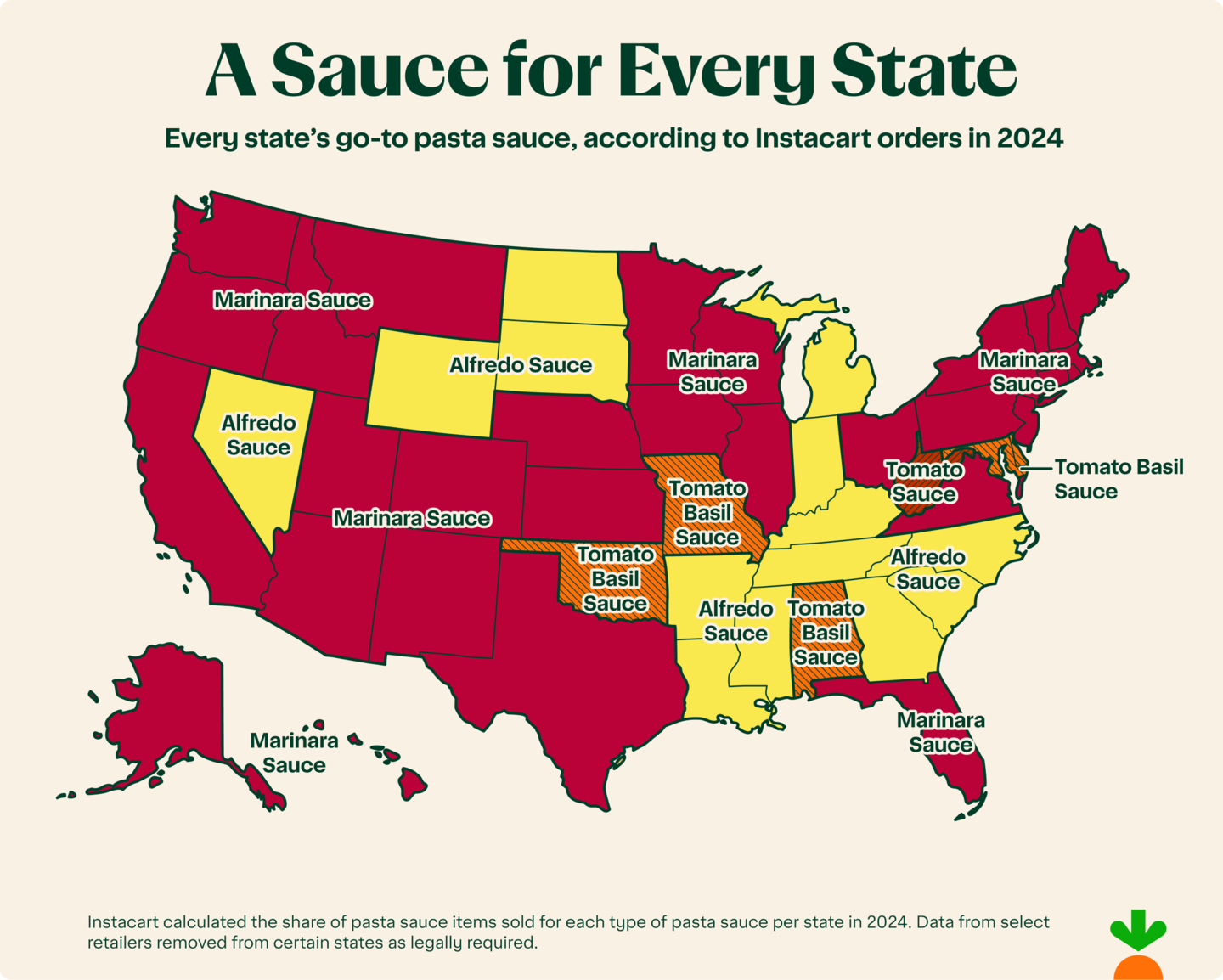 To celebrate National Sauce Month this March, Instacart takes an in-depth look at the most popular pasta sauces across the nation, by city and state, according to its proprietary data. Whether you prefer a fresh pesto or tangy marinara, it's clear this is a nation that loves to get saucy. Through a delicious data deep dive, take a look at the sauces most frequently landing in consumer carts and the ones that might be left on the shelf.