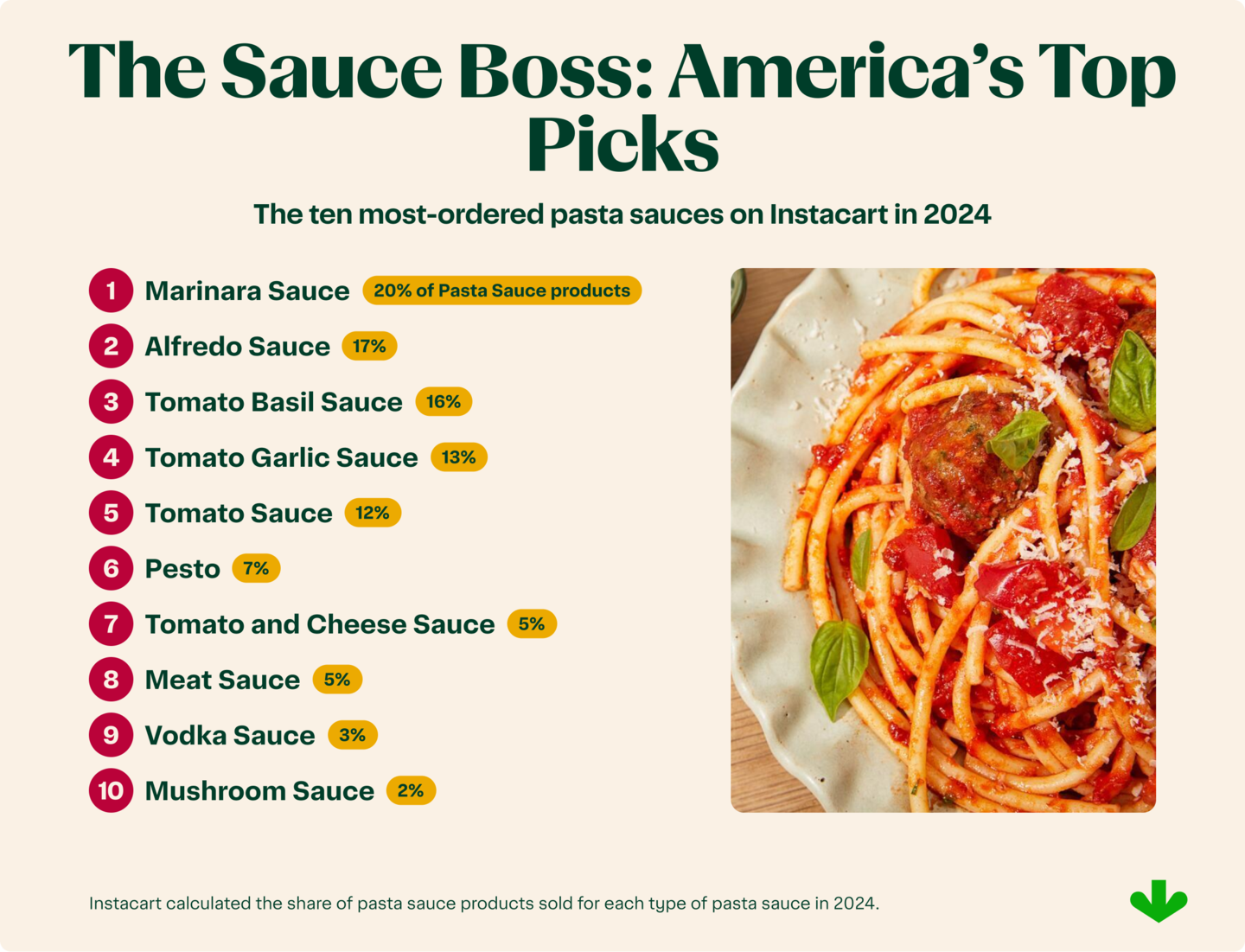 Topping the list of all sauces sold, marinara came in first place, amassing 20% of pasta sauce purchased in 2024, followed by alfredo at 17% and tomato basil at 16%. In fact, these three sauces were so popular that they accounted for over half of all purchases.