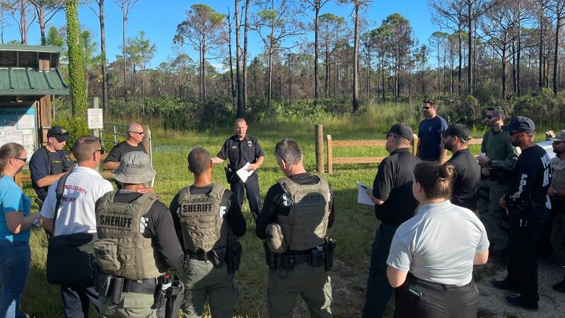 Brian Laundrie search Authorities in Florida gather to search the Carlton Reserve in Sarasota County on Wednesday, Sept. 21, 2021, for signs of Brian Laundrie, the fiance of Gabrielle "Gabby" Petito. Family members said Laundrie was last seen Tuesday, Sept. 14, 2021. He was named a person of interest in Petito's death after an autopsy on Tuesday, Sept. 21, 2021, confirmed her remains had been found in Wyoming. (North Port Police Department)