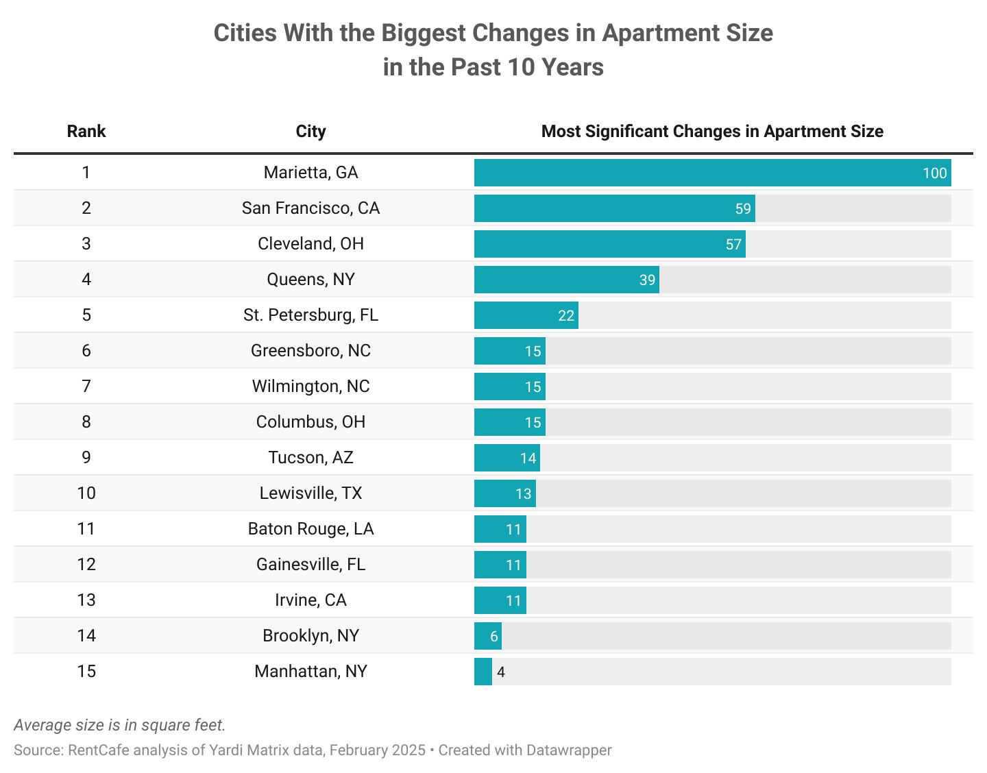 Next is San Francisco, where renters will find that new apartments expanded by 59 square feet. Cleveland comes third with a 57-square-foot increase, while Queens follows with a 39-square-foot increase. Rounding out the top five is St. Petersburg, Florida, where apartments are now 22 square feet larger than those built a decade before.