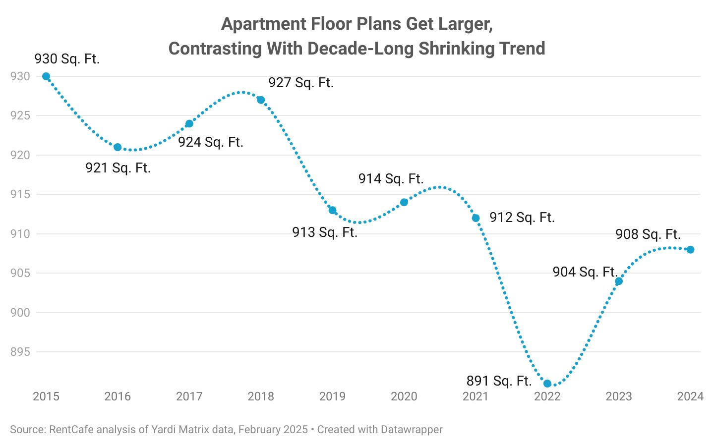 Just in time for the start of the moving season, bigger apartments are making a comeback, as hybrid and remote work along with suburban living turned "more space" into a coveted amenity. RentCafe.com's annual report on apartment size found that the average size of new apartments grew in 2024, reversing a decade-long trend of more compact living space.