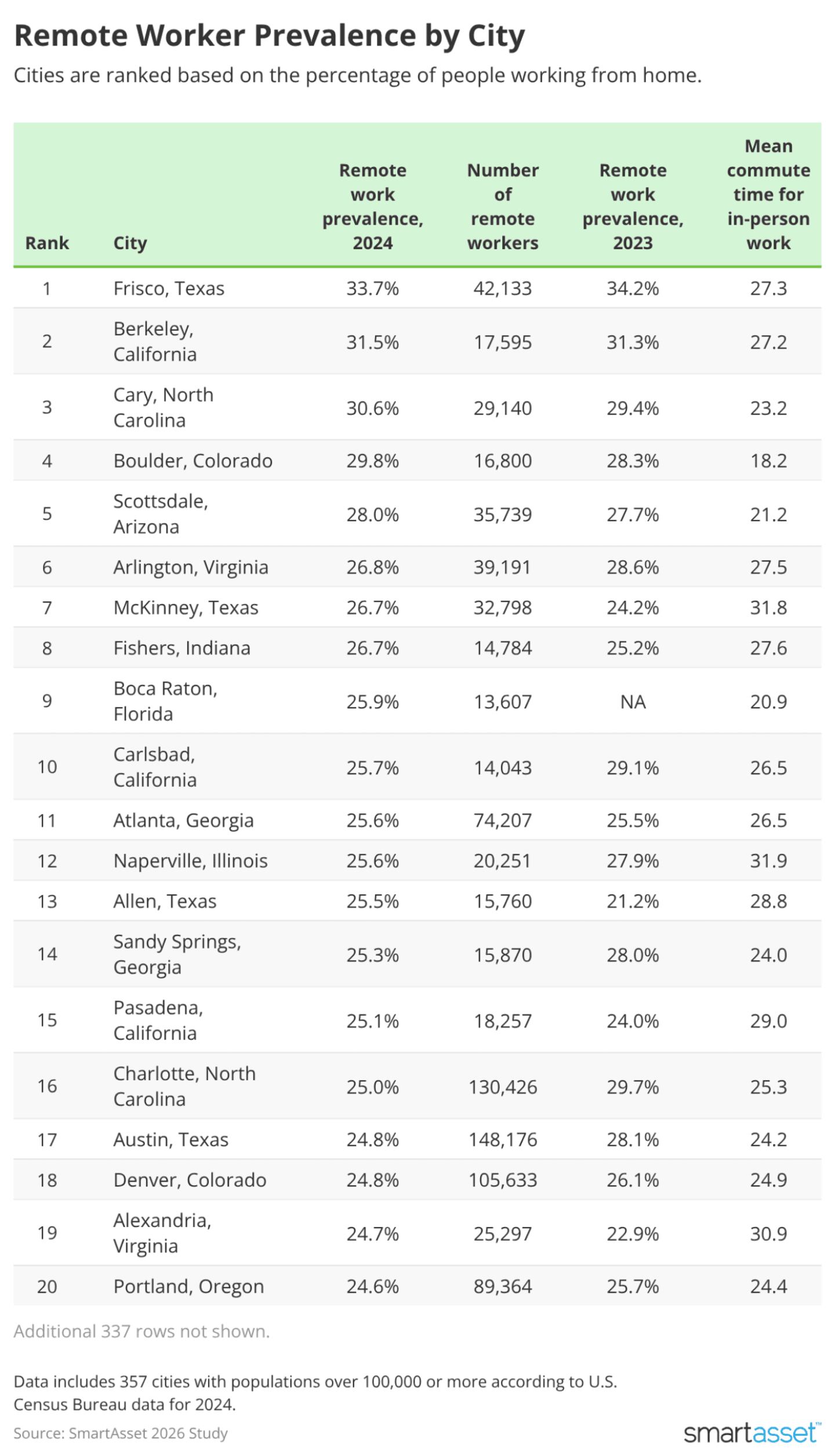 • One-third of workers are remote in Frisco, Texas. Frisco remains the top city for remote work with 33.7% of workers aged 16 and up working from home, despite a slight decline from 34.2% a year earlier. The rest of the top five saw slight to moderate increases in remote work year over year, including Berkeley, California (31.5%); Cary, North Carolina (30.6%); Boulder, Colorado (29.8%); and Scottsdale, Arizona (28%).