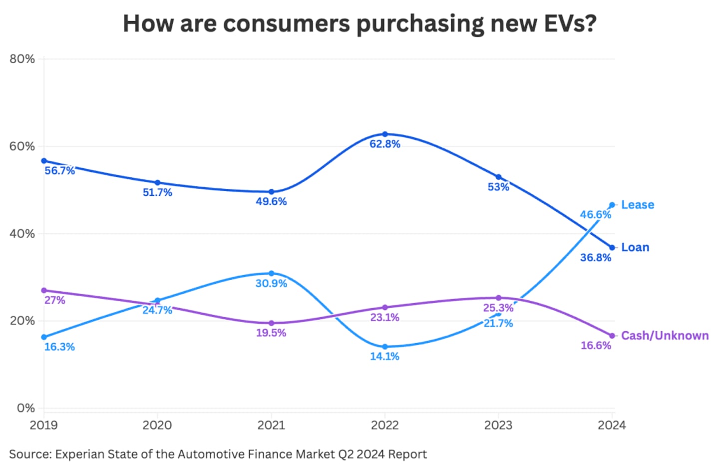 Leasing has taken the lead in how Americans are choosing to drive electric. According to Experian's Q4 2024 State of the Automotive Finance Market Report, more than half of new electric vehicle transactions in early 2024 were leases, a big shift from past years, when most buyers either paid in cash or financed their vehicles with traditional loans. So what's behind this trend?